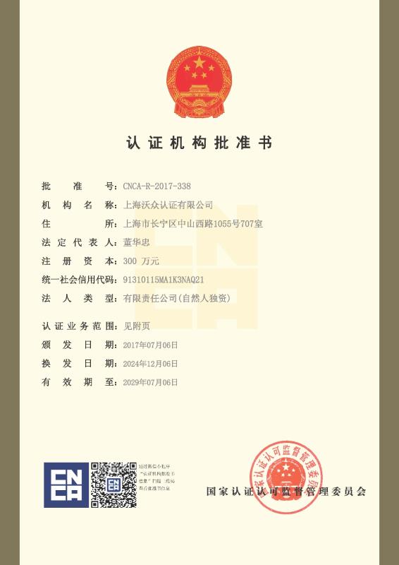 上海沃眾認證有限公司于2017年由國家工商管理局批準成立,并由中國國家認證認可監督管理委員會(CNCA)批準設立(批準號:CNCA-R-2017-338)的認證機構,坐落在上海市長寧區,從事(ISO9001)質量管理體系認證、(ISO14001)環境管理體系認證、(ISO45001)職業健康安全管理體系認證和(GB/T27922)商品售后服務評價體系認證。在未來發展的道路上,將會把標準研發、標準技術信息提供和管理體系認證服務集于一體,成為最大的國際標準管理體系認證服務機構之一。同時也將走出中國,踏上國際…